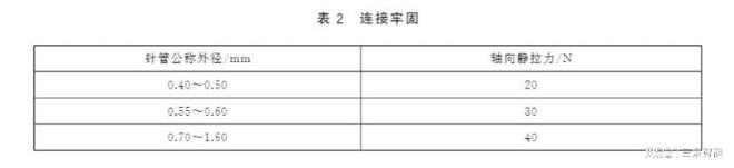 针管与针座的连接牢固度是注射针安全性的关键。《YY/T 0282—2024》标准规定了不同公称外径针管的轴向静拉力要求,如下表所示: