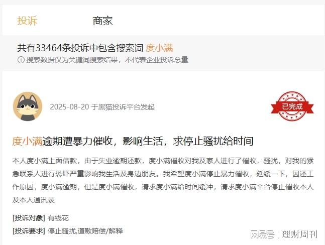 在黑猫投诉平台,“度小满”相关投诉量超3.3万条,而搜索度小满旗下的信贷服务品牌“有钱花”出现的维权信息甚至超6万条。暴力催收、利息宣传不符、莫名扣费等问题最为集中。2025年8月20日,有用户投诉称,其因失业导致借款逾期,度小满便对其家人及紧急联系人进行骚扰恐吓,严重影响了正常生活,恳请平台停止暴力催收并给予还款宽限期。
