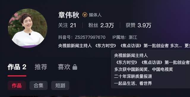 主持人章伟秋是于2025年9月11号中午11:30正式发布第一个短视频的,短短一周时间章伟秋老师就收获了2万多粉丝。值得一提的是章伟秋老师在自己的个人简介中写到:央视前新闻主持人《东方时空》《焦点访谈》第一批创业者多次获中国新闻奖、中国电视奖二十年深耕质量报道一起品生活、看世界