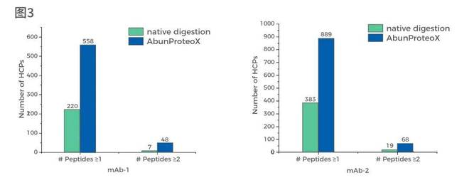 图3比较了AbunProteoX与常规非变性酶解方法在单抗样品中富集HCP的能力。相较于传统的非变性酶解技术,AbunProteoX能够更有效地富集HCP,从而增强了质谱对HCP检测的灵敏度。