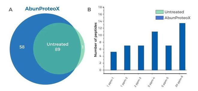 实验中,利用AbunProteoX对HCP进行捕获,随后通过质谱技术对捕获的蛋白质进行鉴定;对比分析了AbunProteoX富集后的HCP检测结果和常规的非变性酶解方法,以及未使用AbunProteoX的对照组进行了比较。