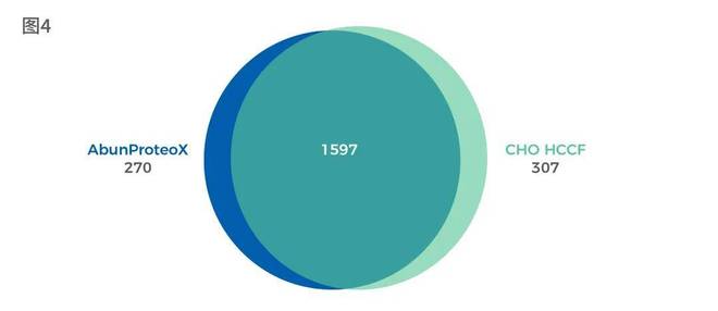 图4 取一份CHO HCCF均分成两组,一组经由AbunProteoX处理,另一组则不经过AbunProteoX处理,进行HCP LC-MS检测获得蛋白谱结果,两者的一致性大于86%,并表明了AbunProteoX能够富集多样的HCPs。